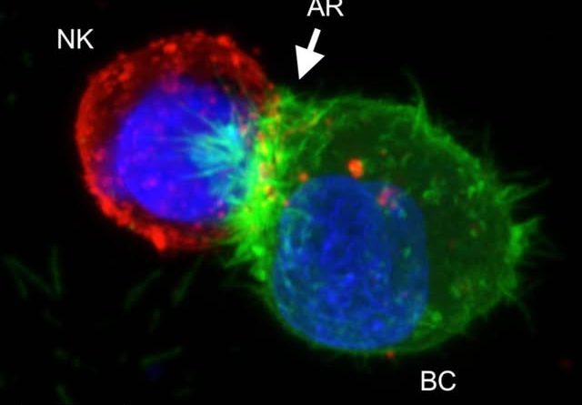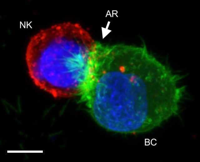 NK cell กำลังพิฆาตเซลล์มะเร็งเต้านม (BC: Breast cancer cell) ด้วยการหลั่งพิษชื่อ granzyme ออกไป เพื่อเปิดสวิตซ์ทำลายตัวเอง