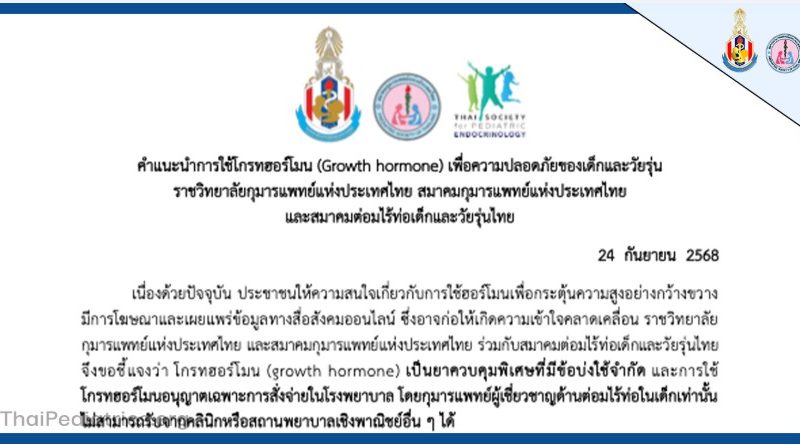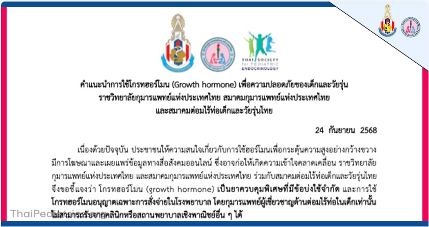 คำแนะนำการใช้โกรทฮอร์โมน (Growth hormone) เพื่อความปลอดภัยของเด็กและวัยรุ่นราชวิทยาลัยกุมารแพทย์แห่งประเทศไทย สมาคมกุมารแพทย์แห่งประเทศไทยและสมาคมต่อมไร้ท่อเด็กและวัยรุ่นไทย 24 กันยายน 2568